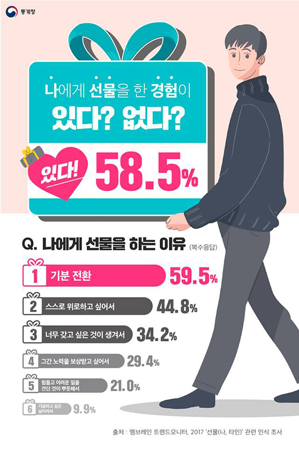 시장조사전문기업 엠브레인 트렌드모니터(trendmonitor.co.kr)가 전국 만 19~59세 성인남녀 1000명을 대상으로 ‘선물’ 관련 인식 조사를 실시한 결과, 응답자 중 절반 이상(58.5%)이 ‘나에게 선물을 한 경험이 있다’고 밝혔습니다.