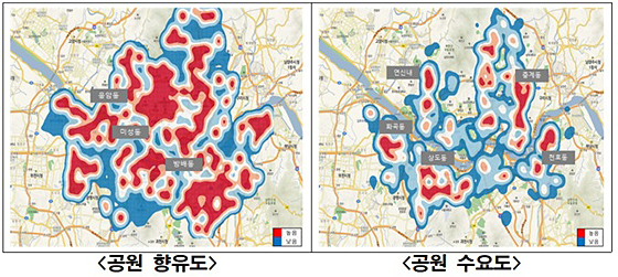 그 결과 공원의 경우 응암동, 미성동, 방배동 인근 등이 향유도가 낮은 것으로 나타났으며, 인구밀도까지 고려한 수요도는 연신내·화곡동·상도동 인근이 높은 것으로 나타났다.