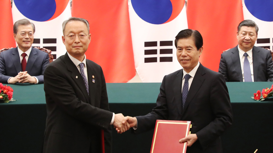 문재인 대통령과 시진핑 중국 국가주석이 지난해 12월 14일 오후 베이징 인민대회당 서대청에서 백운규 산업부 장관(왼쪽)과 중산 중국 상무부장이 한-중 FTA 서비스 투자 협상 개시 MOU를 체결하는 모습을 지켜보고 있다. (사진=(c)연합뉴스)앞서 양국은 지난해 12월 한·중 정상회담에서 서비스·투자 후속협상 개시에 합의했다. 이후 우리 정부는 통상조약의 체결 절차 및 이행에 관한 법률에 따라 공청회, 국회 보고 등 국내절차를 마무리했다.