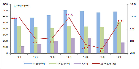 2017년 무역수지 흑자의 큰 폭 감소는 자동차 및 자동차부품·무선통신기기의 수출은 부진한데 반해 반도체제조용장비·반도체·LPG의 수입은 증가한데 기인했다고 산업부는 설명했다.