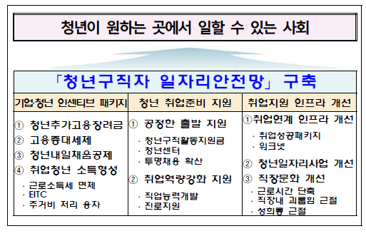 정부는 이 같은 대책을 통해 2021년까지 18만∼22만 명의 추가고용을 창출, 역대 최악의 청년실업난에 베이비붐 세대의 자녀인 에코붐 세대 39만 명의 노동시장 진입이 겹치면서 예고된 재난을 막고 청년실업률을 8% 이하로 떨어뜨린다는 계획이다.