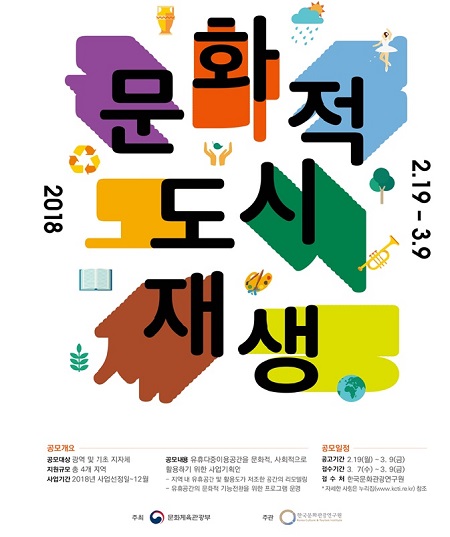[일간환경연합 한선미 기자]문화체육관광부와 한국문화관광연구원은 ‘2018 문화적 도시재생 사업’ 공모 결과 충남 천안시, 전북 군산시, 경북 포항시, 부산 영도구 등 총 4곳을 최종 사업지로 선정했다고 20일 밝혔다.
