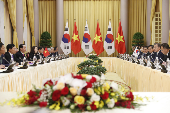 [일간환경연합 김경훈 기자]베트남을 국빈 방문한 문재인 대통령은 23일(현지시간) 하노이 주석궁에서 쩐 다이 꽝 국가주석과 정상회담을 갖고 양국 공동언론발표문을 채택했다.