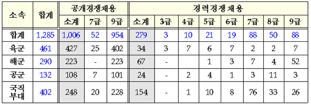 이는 2017년도 채용인원 849명 대비 51%가 증가(436명)한 규모로 무자격 의무병 대체인력(122명), 육군 군수지원여단 개편 인력(66명), 무기체계 전력화에 따른 정비인력 보강 소요(17명) 등이 반영된 결과다.