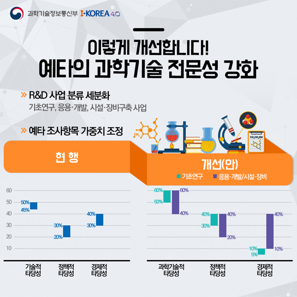 과기정통부는 먼저 평가항목 비율에서 기존에 30∼40%였던 경제성을 기초연구는 5∼10%, 응용개발은 10∼40%로 축소하고 과학기술성도 기초연구는 50∼60%, 응용개발·시설장비 구축은 40∼60%로 조정해 전문성을 강화한다.