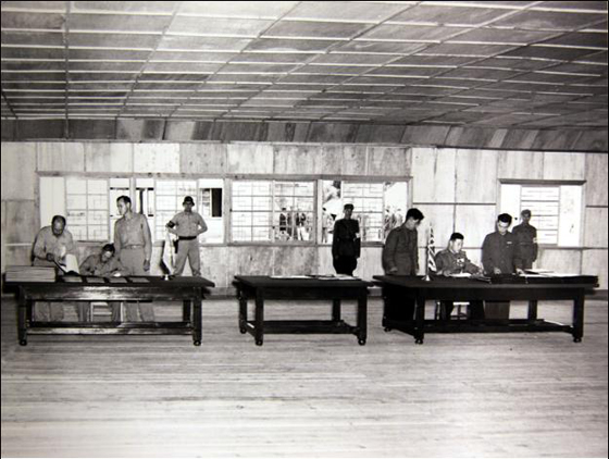 1953년 7월 27일 판문점에서 열린 휴전협정 조인식 모습. 왼쪽 책상에 앉은 사람이 유엔군 수석대표 윌리엄 해리슨(William K. Harrison Jr.) 중장이고 오른쪽 책상에 앉은 사람이 공산군 수석대표 남일 대장이다. 1953년 7월 27일 미군이 촬영한 사진으로, 국사편찬위원회가 미국 국립문서기록관리청(NARA)에서 수집했다. (사진 = 국사편찬위원회) |