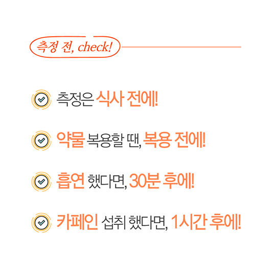 혈압 측정 전 체크할 사항은 ▲측정은 식사 전에 ▲약물 복용할 땐, 복용 전에 ▲흡연했다면, 30분 후에 ▲카페인 섭취했다면, 1시간 후에 하는 것이 좋습니다.
