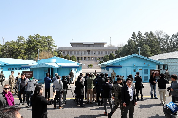 지난 4월 18일 진행된 판문점 프레스투어 당시 판문점 ‘자유의 집’ 앞 군사분계선 근처에서 외신기자들이 앞다퉈 촬영하고 있다. |