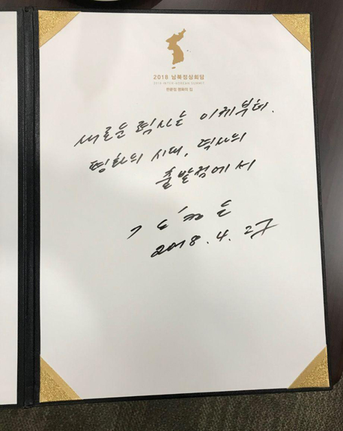 평화의 집 1층에서 김정은 국무위원장은 방명록에 “새로운 역사는 이제부터, 평화의 시대, 역사의 출발점에서”라고 서명했다.