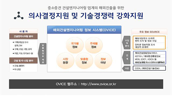 해외건설엔지니어링 정보시스템(OVICE)은 해외 진출 대상 국가에 대한 정보 수집에 어려움을 겪고 있는 우리나라 중소·중견 건설엔지니어링 기업을 지원하기 위해 2014년부터 연구개발(R&D) 사업으로 추진 중인 정보제공 시스템이다.