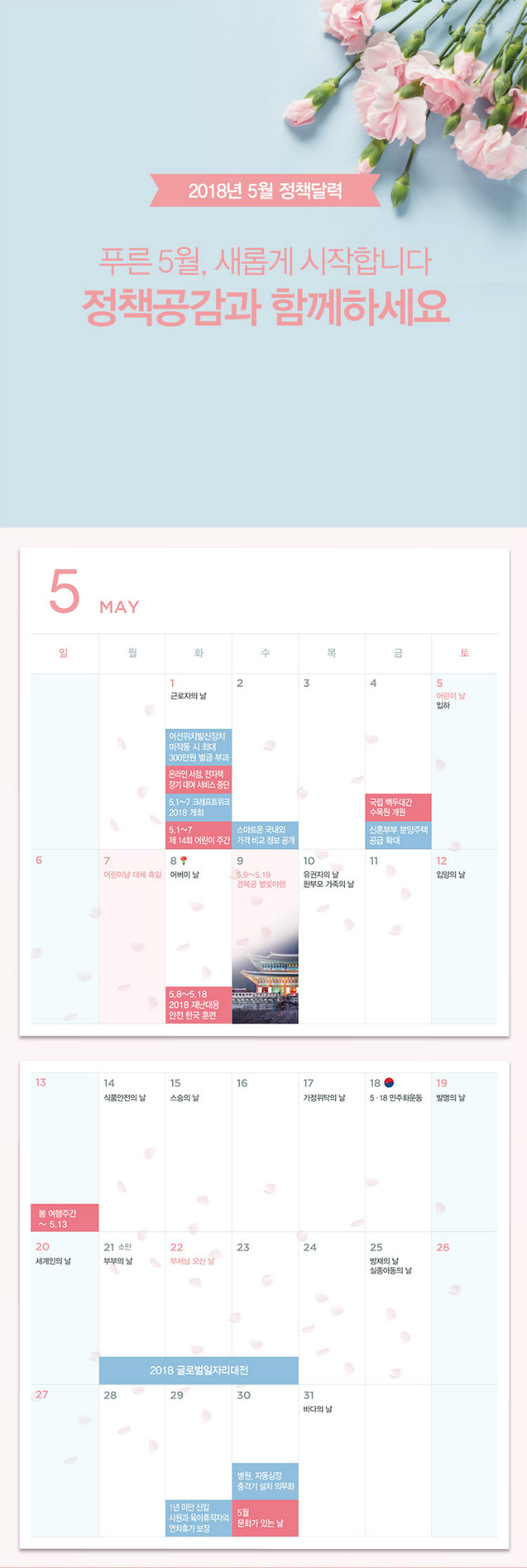 [일간환경연합 장민주 기자]5월 달라지는 정책입니다. 2018년 5월의 정책소식을 정책달력으로 한눈에 확인하세요!