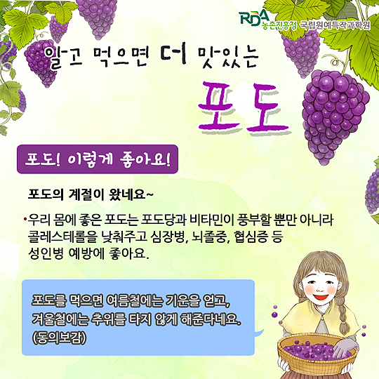 [일간환경연합 장민주 기자]포도는 '‎포도당'과 '‎비타민'이 풍부하고, '‎성인병 예방'에 좋다고 해요~