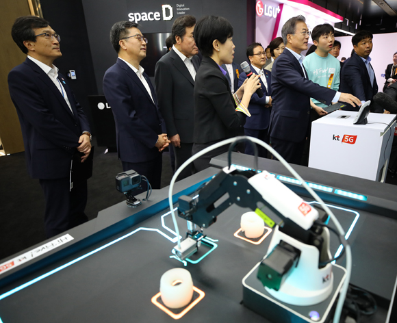 문재인 대통령이 17일 오후 서울 강서구 마곡 R&D 단지에서 열린 혁신성장 보고대회에서 KT 부스를 방문, 5G를 이용한 동작인식을 체험하고 있다. <(c) 연합뉴스> |