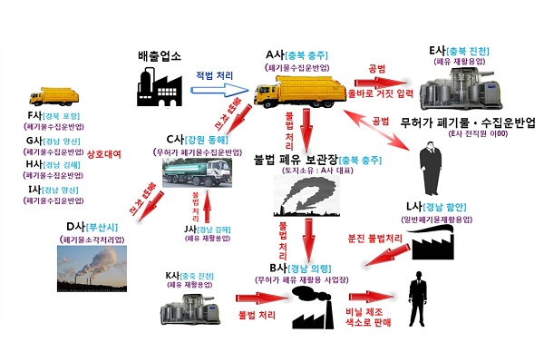 이번 수사의 발단이 된 지정폐기물 수집·운반업체 A사는 폐기물처리업체 E사와 공모하여 A사와 E사 간에 적법하게 폐기물을 처리한 것처럼 올바로시스템에 거짓으로 입력했다. 이 같은 수법으로 지정폐기물인 폐유 1,102톤을 총 69회에 걸쳐 E사가 아닌 타 업체를 통해 불법으로 처리했다.