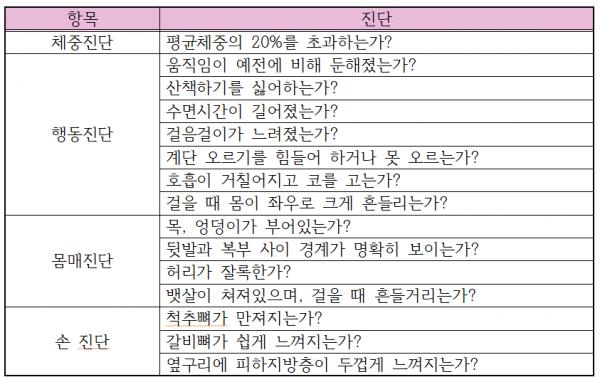 움직임이 둔하거나 활동성이 떨어지는 경우, 바른 자세로 서 있는 모습을 관찰해 허리가 잘록해 보이지 않는다거나, 목과 엉덩이 주위가 부풀어 보일 때도 비만을 의심해 봐야 한다.