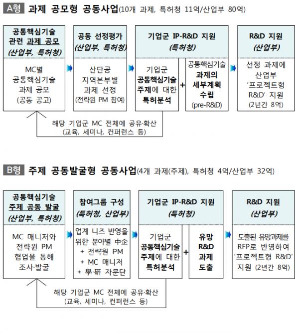 세부적으로, 산업부는 기업간 네트워크 강화, R&D, 사업화 등에 과제당 2년간 최대 8억원을, 특허청은 R&D 세부계획 수립 등을 위한 IP-R&D 전략 컨설팅에 과제당 1억원을 지원한다.