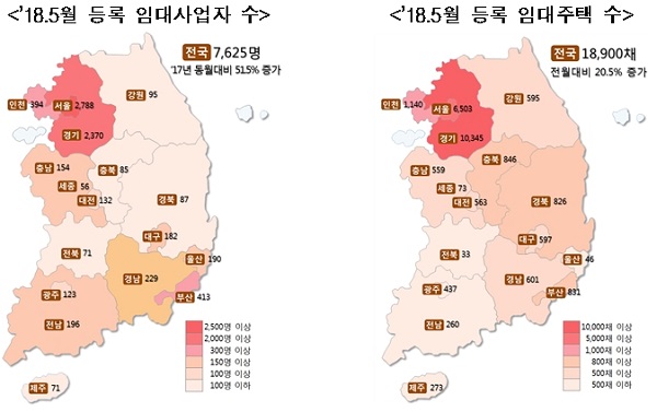 5월에 등록한 임대사업자 수는 전년동월에 비해 51.5% 증가하였으며, 작년 한해 월평균에 비해서도 46.1% 증가하여, 누계로 총 32.5만명이 임대사업자로 등록했다.