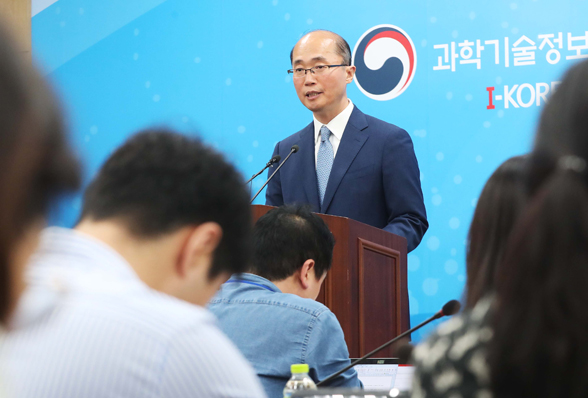 18일 정부과천청사 과학기술정보통신부 브리핑룸에서 류제명 전파정책국장이 5G 주파수 경매 결과를 설명하고 있다. (사진=(c) 연합뉴스) |