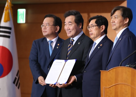 이낙연 국무총리가 이날 정부서울청사에서 대국민담화문을 먼저 낭독하고 박상기 법무부 장관과 김부겸 행정안전부 장관은 ‘검·경 수사권 조정 합의문’에 서명했다.