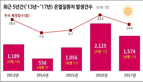 [일간환경연합 신상미 기자]최근 5년간 폭염으로 일사병과 열사병 등 온열질환자가 6500명 발생해 이 가운데 54명이 사망한 것으로 나타났다.