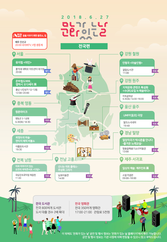 [일간환경연합 김경훈 기자]6월을 맞아 일상에서 문화를 더욱 쉽게 접할 수 있도록 매달 마지막 수요일인 오는 27일과 해당 주간에 전국에서 ‘청춘마이크’, 야외 공연, 문화예술 체험 등 총 2494개의 문화행사를 개최한다.