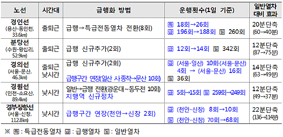 국토부와 한국철도공사는 지난해 7월 경인선·수인선·안산선·경의선 4개 노선에 대해 총 44회의 급행열차를 확대해 일반열차 대비 운행시간을 최대 20분 단축하고 하루 평균 1.8만 명의 수요증대 효과를 거둔바 있다.