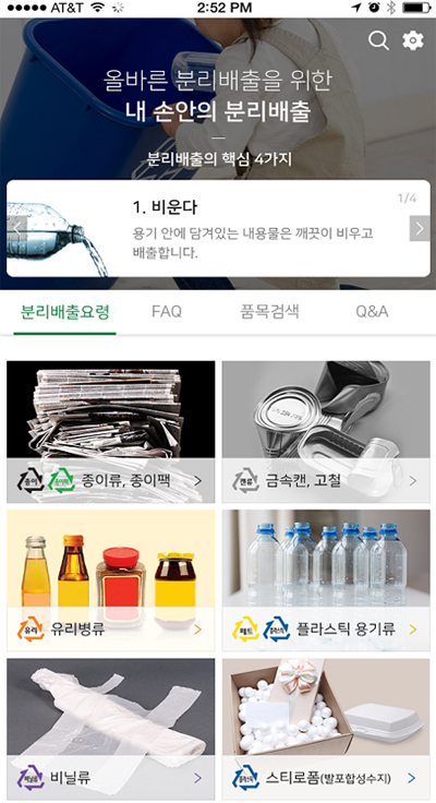 앱은 ▲분리배출 핵심 4가지 방법(비운다·헹군다·분리한다·섞지 않는다) ▲페트병 등 품목별 올바른 분리배출 요령 ▲분리 배출할 때 헷갈리는 사례 문답풀이 등을 사진과 함께 게재했다.