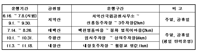 - 치악산 등 국립공원 4곳에서 7월부터 11월까지 친환경 전기버스 1대 순차적 운행