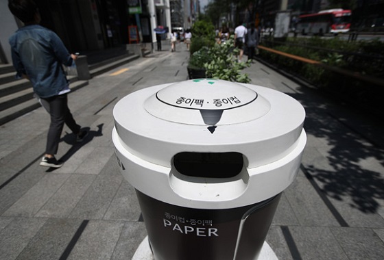 서울 서초구 강남대로에 있는 일회용 컵 전용 수거함 옆으로 시민들이 지나가고 있다.(사진=(c) 연합뉴스) |