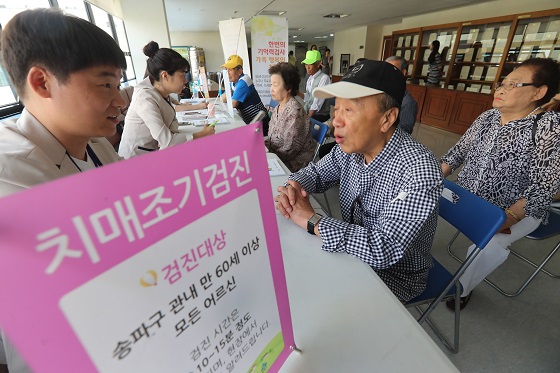 서울시 송파구청에서 열린 제1회 노인학대예방의 날 기념행사에서 어르신들이 치매 예방 조기 검진을 받고 있다.(사진=(c) 연합뉴스) |