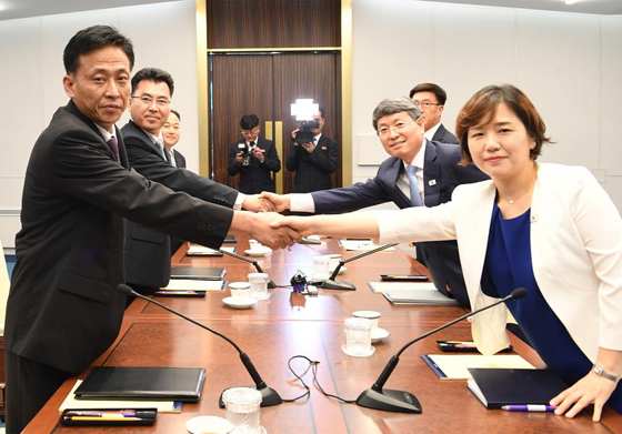 4일 오전 판문점 남측 평화의 집에서 열린 남북 산림협력 분과회담에서 우리측 수석대표인 류광수 산림청 차장(오른쪽 두번째)과 김성준 북한 국토환경보호성 산림총국 부총국장(왼쪽 두번째) 등 양측 대표단이 회담에 앞서 악수하고 있다 |