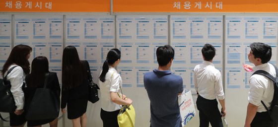 한 채용박람회에서 구직자들이 채용공고 게시판을 살펴보고 있다.(사진=(c) 연합뉴스) |