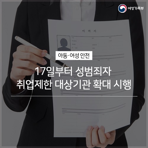 여성가족부는 오는 17일부터 ‘아동·청소년의 성보호에 관한 일부개정법률(이하 청소년성보호법)’ 시행으로 성범죄자 취업제한제도가 확대된다고 10일 밝혔다.