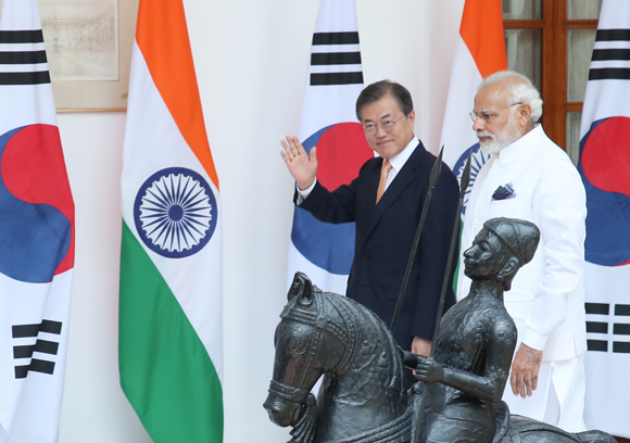 인도를 국빈방문 중인 문재인 대통령이 10일 오전(현지시간) 뉴델리 영빈관에서 나렌드라 모디 인도 총리와 한·인도 단독정상회담을 하기 위해 입장하며 손을 흔들고 있다. (사진=(c) 연합뉴스) |