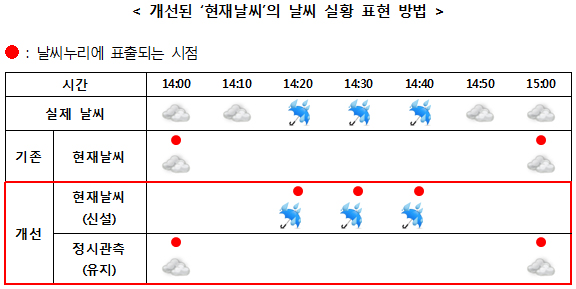 기존의 ‘현재날씨’는 날씨 정보를 정시(60분 간격)마다 제공했으나 정시 사이에 비가 오면 해당 정보가 나타나지 않아 개선이 필요하다는 지적이 꾸준히 제기됐다.