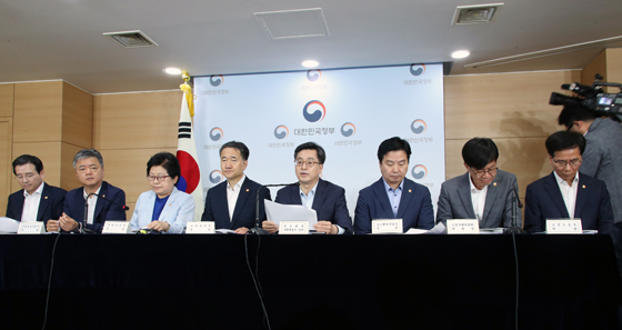 김동연 경제부총리 겸 기획재정부 장관(오른쪽 네번째)이 18일 서울 세종로 정부서울청사에서 ‘하반기 경제정책방향 및 저소득층 지원대책’ 관계부처 합동브리핑을 하고 있다. (사진=(c) 연합뉴스) |