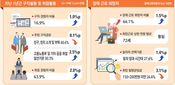 통계청이 24일 발표한 2018년 5월 경제활동인구조사 고령층 부가조사 결과를 보면 55∼79세 고령층 인구 1344만1000명 중 64.1%인 861만 명이 장래에 일하기를 원한다고 답했다. 이는 1년 전보다 1.5%포인트 상승한 것이며 관련 통계가 작성된 2005년 이후 가장 높은 수치다.