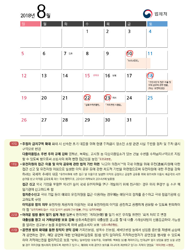 [일간환경연합 김경훈 기자]법제처(처장 김외숙)는 8월에 총 42개 법령이 새로 시행된다고 밝혔다. 주요 시행법령의 내용과 시행일은 다음과 같다.