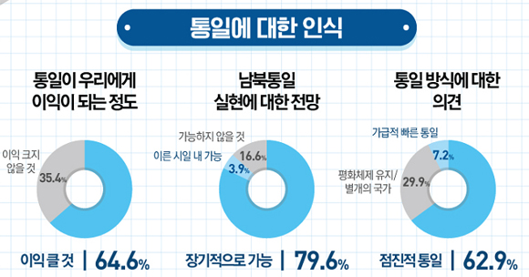 [일간환경연합 한선미 기자]우리 국민의 83.5%는 장기적(79.6%) 혹은 이른 시일 내(3.9%)에 남북통일이 가능할 것으로 전망했다. 또한, ‘통일로 인한 이익이 클 것’이라는 응답은 64.6%로, 국민 상당수가 통일에 대해 긍정적 인식을 갖고 있는 것으로 조사됐다.