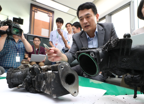 6일 정부세종청사 국토교통부에서 김경욱 교통물류실장이 BMW측에 차량화재관련 조치를 요구한 뒤 목포 주행 중에 화재가 발생한 BMW 디젤차량의 배기가스 재순환 장치(EGR,왼쪽)를 공개하고 있다.(사진=(c) 연합뉴스)국토부는 6일 BMW 코리아 대표 및 본사 임원진과 면담을 갖고 화재사고에 따른 리콜과 관련해 BMW측에 자료제출이 미흡한 점을 언급했다고 밝혔다.