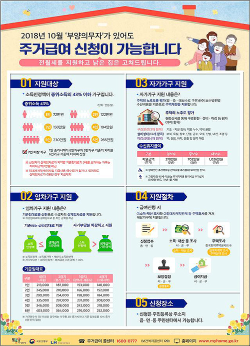 국토부 관계자는 “모든 신규 수급자들이 차질 없이 급여를 지급받을 수 있도록 모든 노력을 기울이겠다”며 “그간 부양의무자 기준으로 인해 주거급여 수급 신청을 하지 않았거나, 선정 과정에서 탈락했던 가구들은 각 읍·면·동 주민센터를 방문해 사전 신청할 것”을 당부했다.