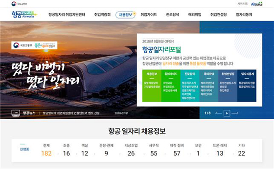 포털에는 공항운영·도심터미널(4곳), 항공운송사업(100곳), 항공기취급업(27곳), 항공기정비업(14곳), 항공운송총대리점업(168곳), 항공기사용사업(42곳), 기타유관기관(4곳) 등 항공사업법에 따른 업종의 일자리가 망라해 있다.