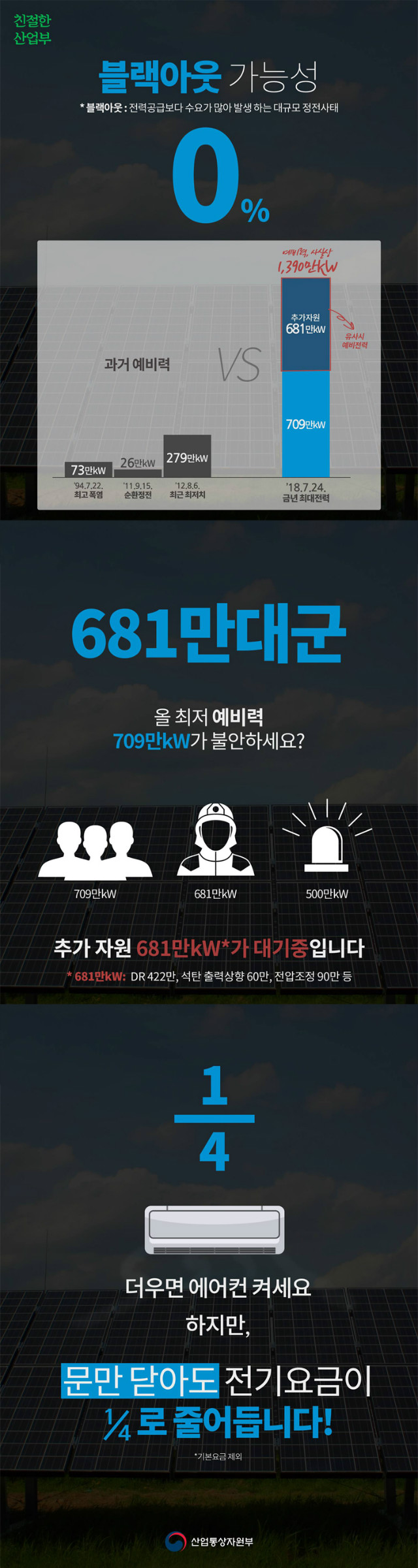 [일간환경연합 장민주 기자]계속되는 무더위에 냉방기를 자주 켜게 되는 요즘. 블랙아웃 걱정은 없는 걸까요? 블랙아웃 가능성은 0! 에어컨 켜고 창문만 잘 닫아도 전기료 걱정은 4분의 1로 줄어든답니다. 친절한 산업부의 카드뉴스로 확인하세요!