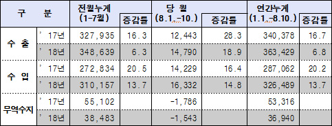 8월1일∼10일 수출입실적(통관기준 잠정치/단위:백만 달러,%)
