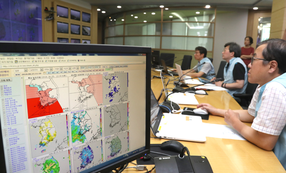23일 오전 서울 기상청 국가기상센터에서 예보관들이 종합관제시스템으로 제19호 태풍 솔릭 현황을 보고 있다. (사진=(c) 연합뉴스) |