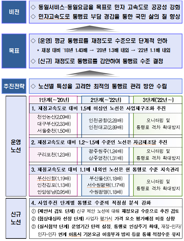 먼저 1단계로 2020년까지 재정고속도로 대비 통행료가 1.5배 이상인 천안논산(2.09배), 대구부산(2.33배), 서울춘천(1.50배) 등 3개 노선은 사업 재구조화 방식으로 통행료 인하를 추진한다.