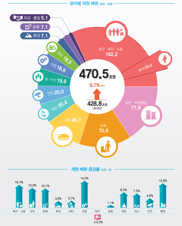 2009년 금융위기를 제외하면 2000년 이후 가장 높은 수준으로 증가한 2019년 예산은 복지분야가 162조 2000억원으로 34.5% 최대 비중을 차지한다. 기초연금과 아동수당 등을 크게 증액하고 한부모 가족 등 소외계층 지원을 넓혔다. 일자리 예산 또한 23조 5000억원으로 대폭 확대 편성했다.