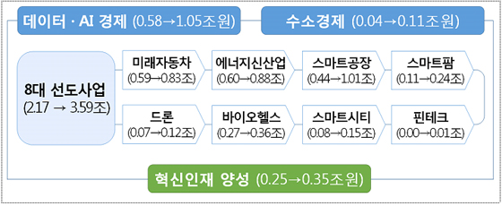 전문가, 민·관 연구기관, 대·중소기업 및 관계부처 등의 의견수렴을 거쳐 투자의 시급성, 발전가능성, 플랫폼·인프라 성격을 기준으로 ‘3+1’(데이터경제·AI·수소경제+혁신인재 양성) 전략투자 분야를 선정했다.