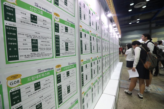 지난해 11월 4일 오후 서울 강남구 코엑스에서 ‘고졸성공 취업 대박람회’를 찾은 학생들이 채용공고 게시대를 둘러보고 있다. (사진=(c) 연합뉴스) |