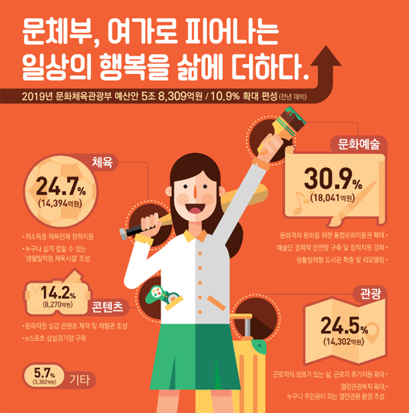 부문별 예산을 보면 문화예술이 1조 8041억원으로 10.1% 늘어 가장 큰 비중(30.9%)을 차지했다.